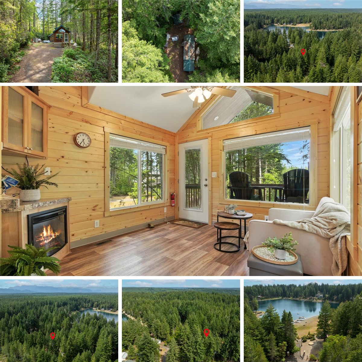 Step inside this cozy fall-perfect tiny cabin in the Maggie Lake community—just 20 minutes from Belfair—and discover how big tiny can feel. Built in 2018, this upgraded park model combines timeless cabin charm with practical comfort: vaulted ceilings, big windows, an electric fireplace, and porchside views of the trees and lake.